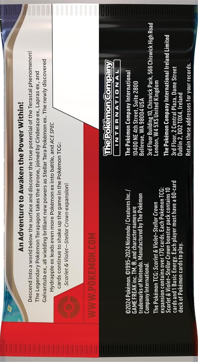 An Adventure to Awaken the Power Within! Descend into a world below the surface and discover the true potential of the Terastal phenomenon! The Legendary Pokémon Terapagos takes the throne, joined by Cinderace ex, Lapras ex, and Galvantula ex, all wielding brilliant new powers as Stellar Tera Pokémon ex. The newly discovered Hydrapple ex leads even more Pokémon ex into battle, and ACE SPEC cards continue to shake up the game in the Pokémon TCG: Scarlet & Violet—Stellar Crown expansion.